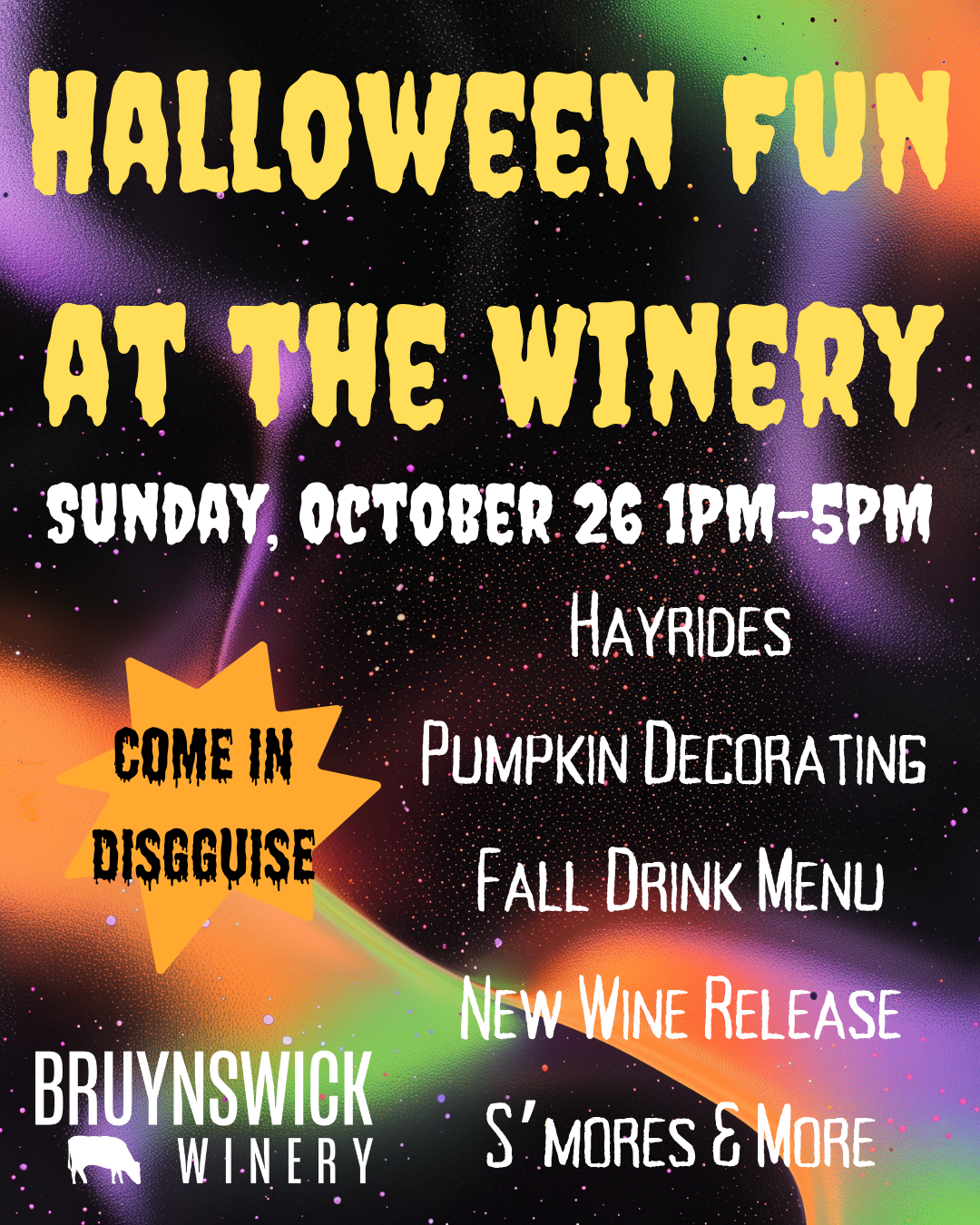The grapes are off the vine, crushed, pressed and fermenting in tank. Come join us for a post harvest and Halloween celebration at the farm Sunday, October 26th 1-5PM. Hayrides, pumpkin decorating (kids and adults), Fall drink menu, fire pit, s’mores and more.